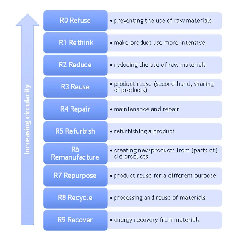 The 9R Strategy Model has also been derived from the 3R framework. The 9R strategy model more specifically covers functions for smarter product manufacturing and use, longer product and component life, and a more rational use of materials. These frameworks help both individuals and companies to take the next step from a linear model to a circular economy. You can read more about the 9R model here.
