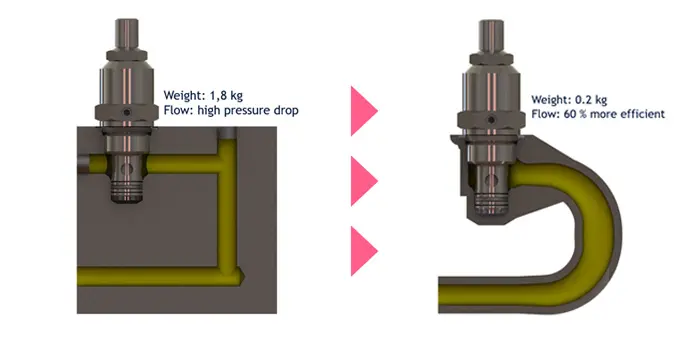 Perinteisesti hydrauliikassa käytetään suoria porauksia ja 90 asteen kulmia, jolloin rakenteeseen jää väkisinkin teräviä kulmia, jotka aiheuttavat pyörteitä, melua ja ennen kaikkea tehohäviöitä. AM-teknologian avulla suuri osa näistä tehohäviöistä voitaisiin välttää yksinkertaisesti tekemällä kanavista muodoltaan jouhevia.