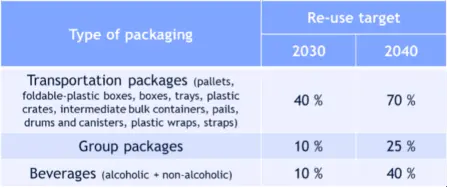 Vuodesta 2030 alkaen kaikkien uusien pakkausten EU:n rajojen sisällä on oltava kierrätettäviä. Pakkausmateriaali on minimoitava, ja uudelleenkäytettäviä pakkauksia on käytettävä aina, kun se on mahdollista. Tavoiteprosentit jaetaan eri pakkausryhmille niiden potentiaalin perusteella.