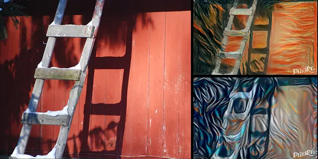 Valokuvasta tekoälyllä muokatut vaihtoehtoiset tyylit (ylemmässä muokkaustyylinä Edvard Munchin Huuto ja alemmassa tunnistamaton maalaus)