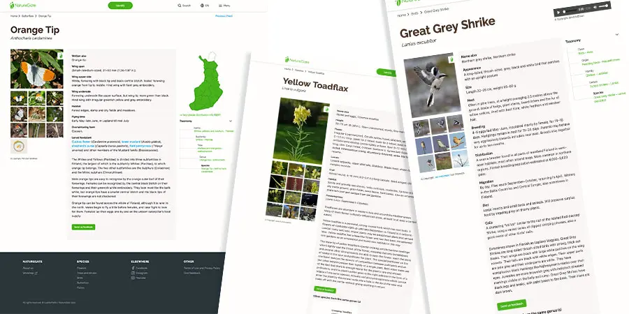 The website NatureGate, founded by Eija and Jouko Lehmuskallio, is a nature lover’s data bank containing information about thousands of wild species found both in Finland and widely in Europe. The goal with our cooperation was to renew the multi-language website, making it more accessible with various devices and giving it good expandability, should the need occur sometime in the future. It was also important to make sure that the website can match the demands posed by ever-increasing user amounts and new technology.