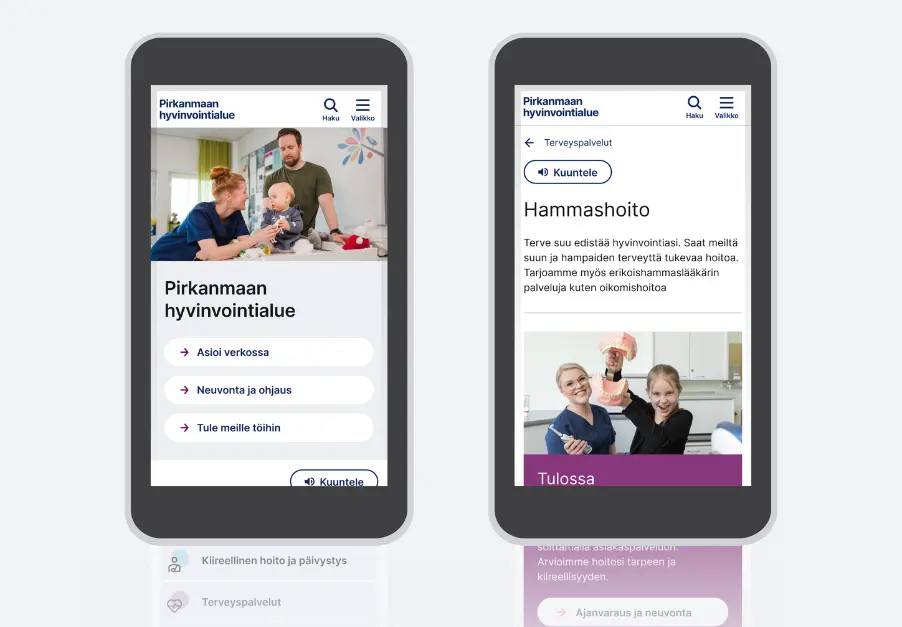 The Wellbeing Services County of Pirkanmaa operates in 23 municipalities. They have a total of more than half a million inhabitants from children to elderly. Pirha wanted to develop their customer experience by renewing their website comprehensively. The goal was to create a website where customers can find the information they need effortlessly. The site should be accessible to everyone, regardless of different habits, needs and skills in using digital services.